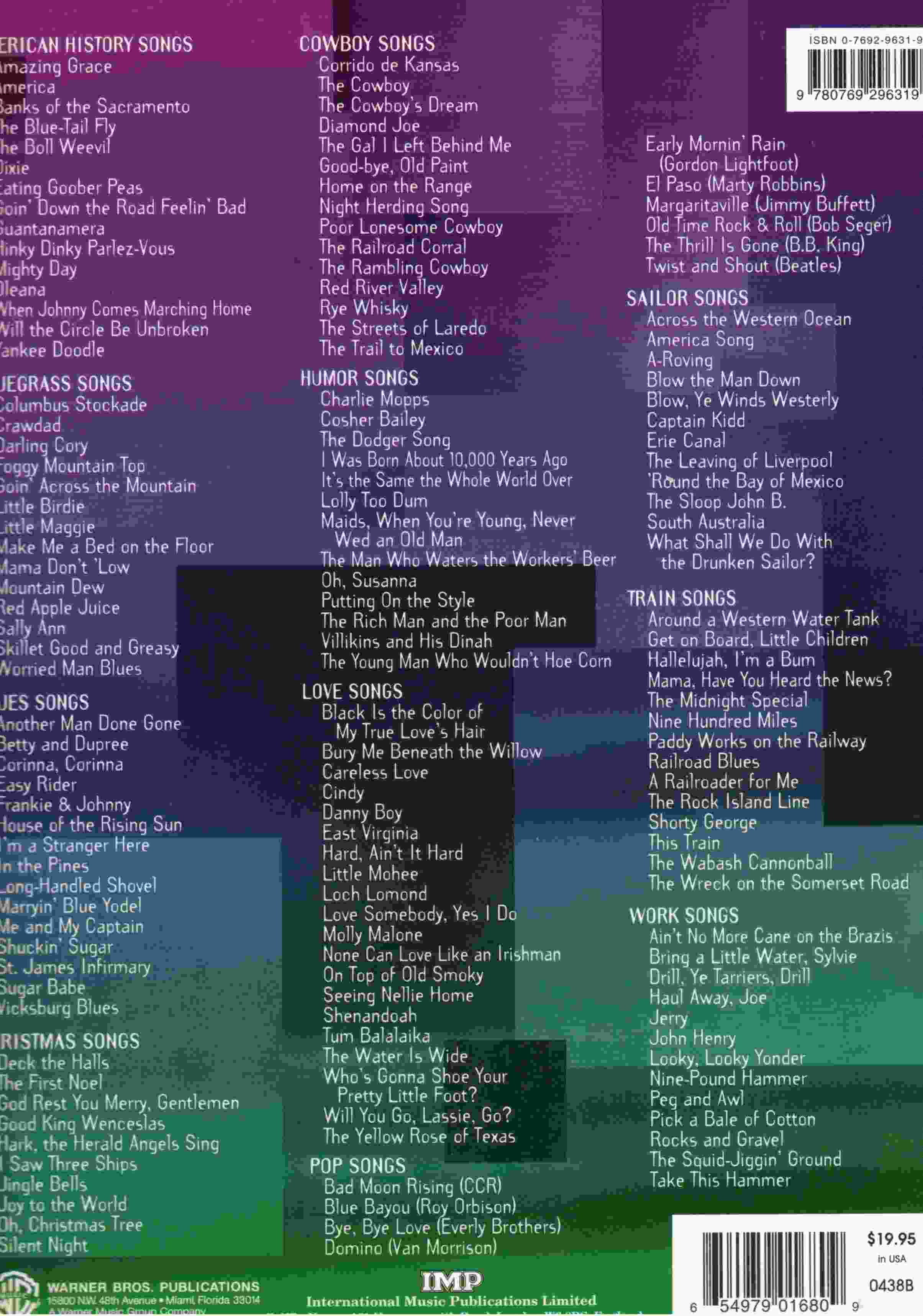 Pop Songs, Train Songs, Work Songs, Sailor Songs, Love Songs, Humor Songs, Cowboy Songs, Chistmas songs, Blues Songs, Bluegrass Songs, American History Songs.
